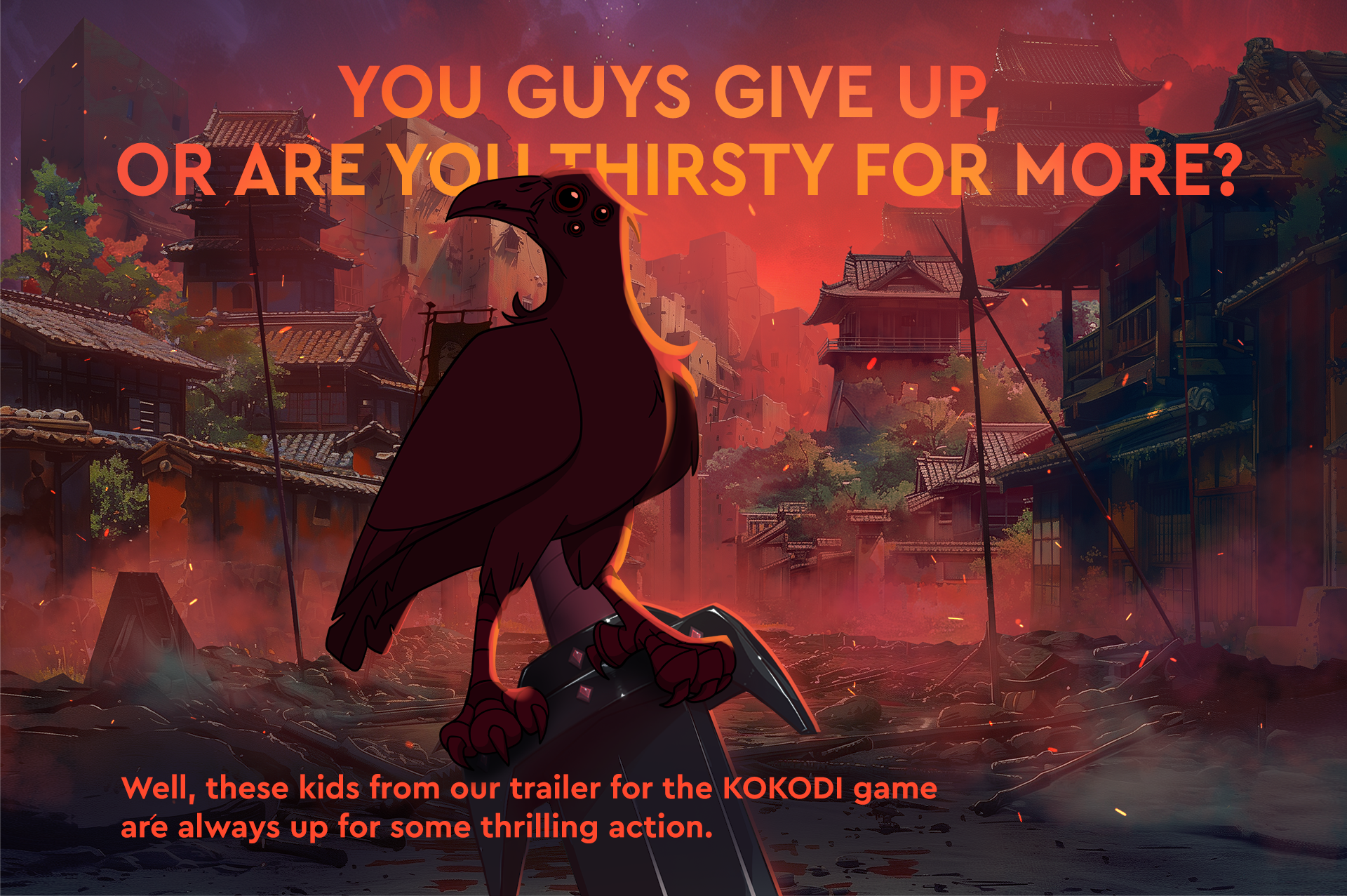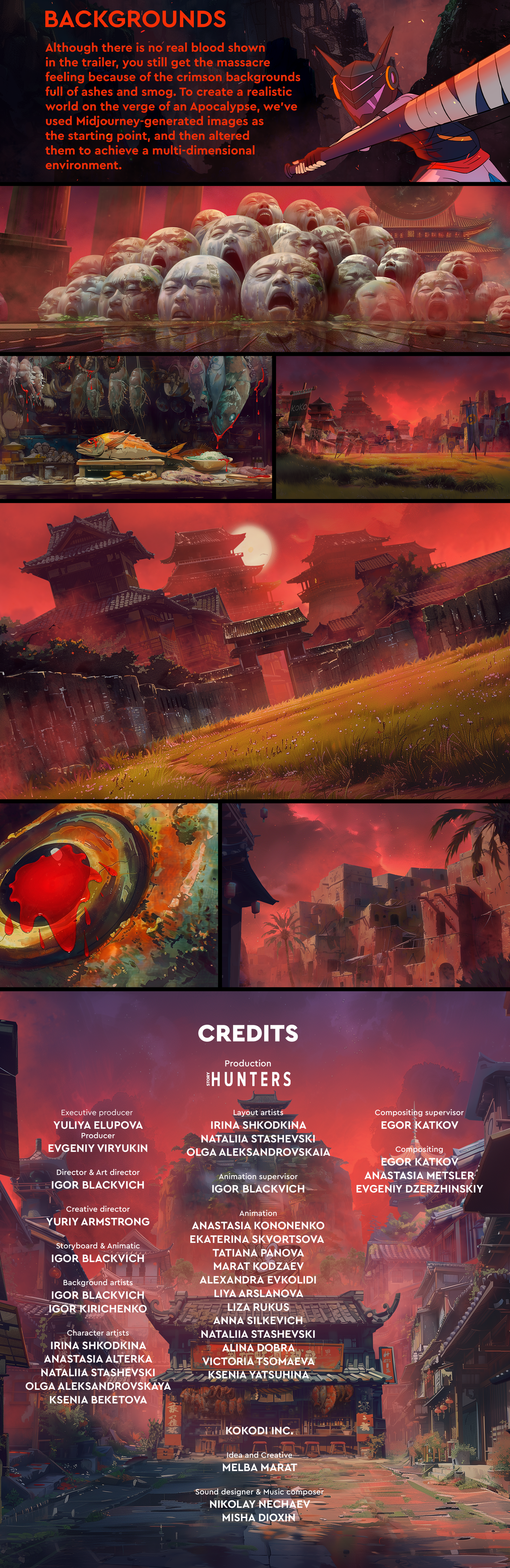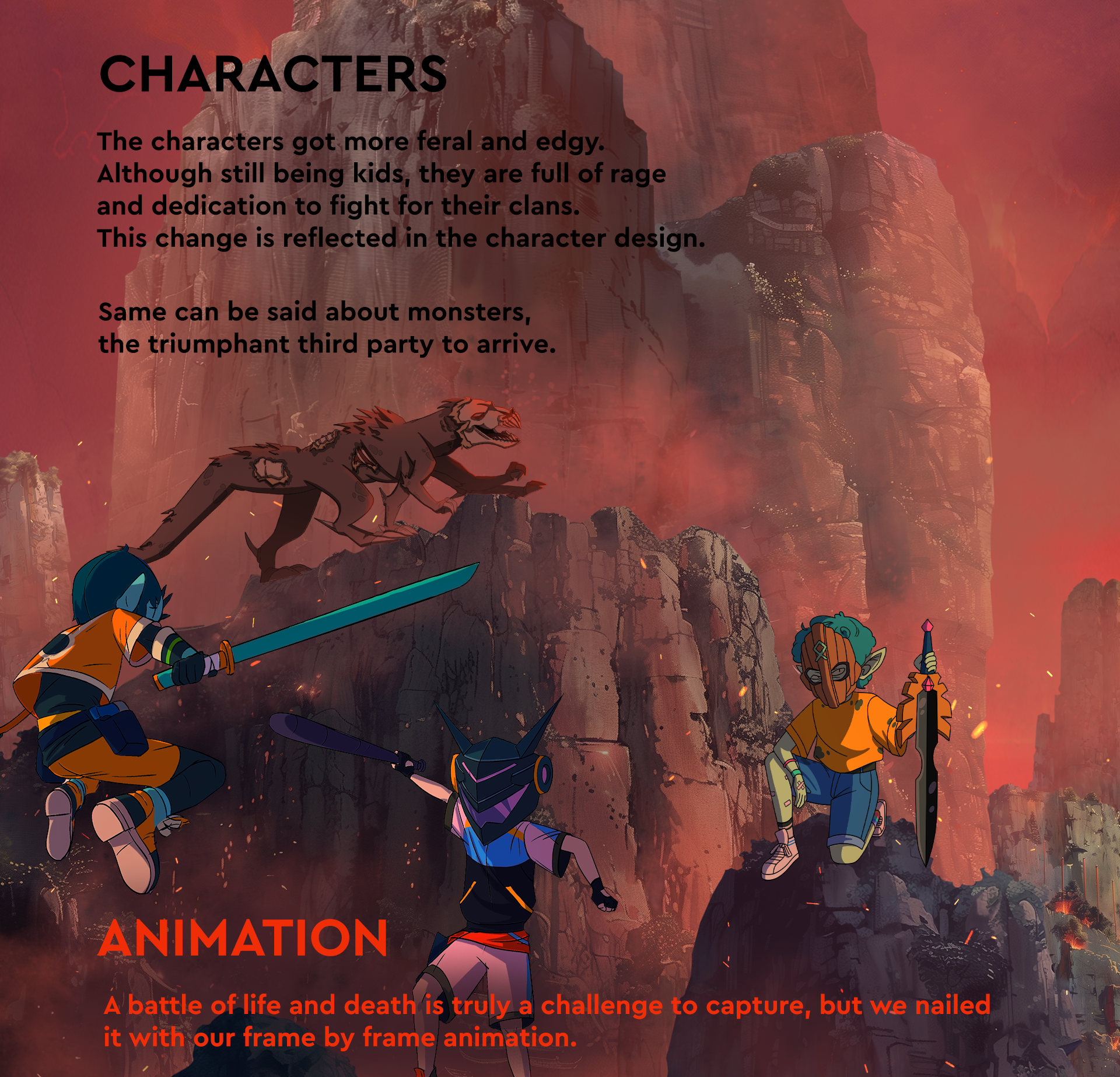 A dark and edgy trailer for an NFT game where children fight against terrifying monsters 2D frame-by-frame character animation, AI backgrounds (Midjourney with modifications in Photoshop)